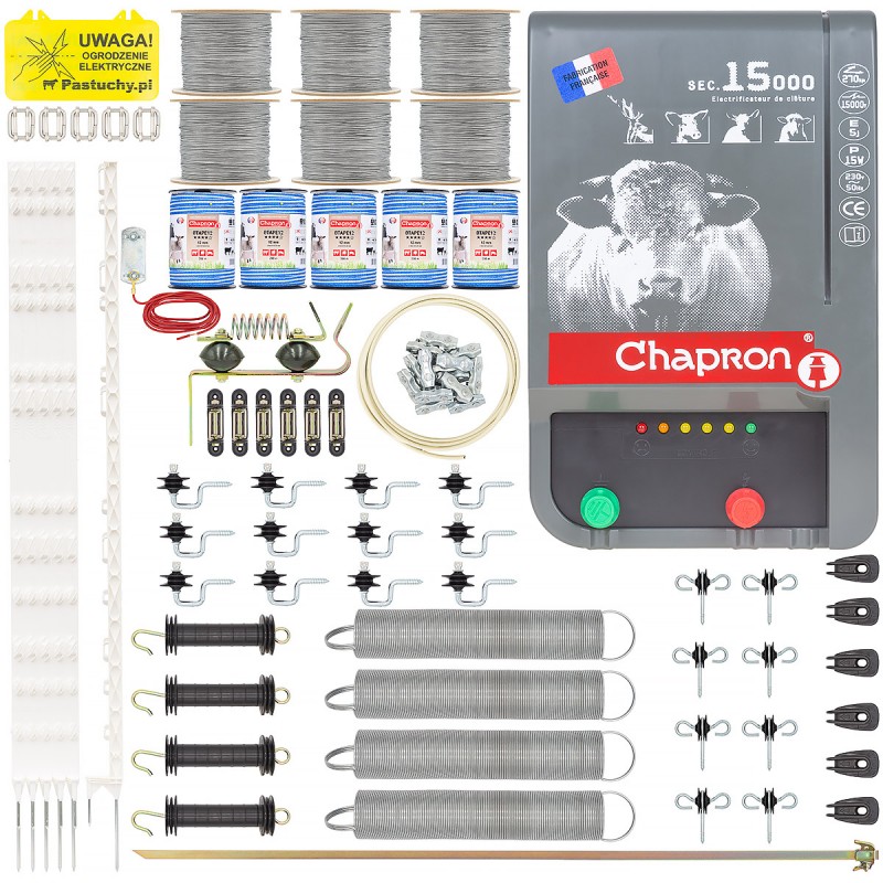 Najważniejszym elementem ogrodzenia elektrycznego jest mocny elektryzator Chapron SEC15000, który podłącza się bezpośrednio do sieci 230V. Generuje on impuls o mocy 8 J i napięciu 15 000 V, co skutkuje bardzo nieprzyjemnym odczuciem po zetknięciu z przewodami pastucha. Co więcej wysokie napięcie wytwarza pole elektromagnetyczne, które zwierzęta wyczuwają z większej odległości, co może spowodować, że sarny czy dziki będą omijać zabezpieczone miejsce nawet jeżeli nie dojdzie do bezpośredniego kontaktu z przewodami ogrodzenia. Elektryzator Chapron SEC15000 jest zdolny do obsługi bardzo długich ogrodzeń, dzięki czemu zestaw pastucha na sarny można rozbudować bez konieczności dokładania kolejnego elektryzatora.