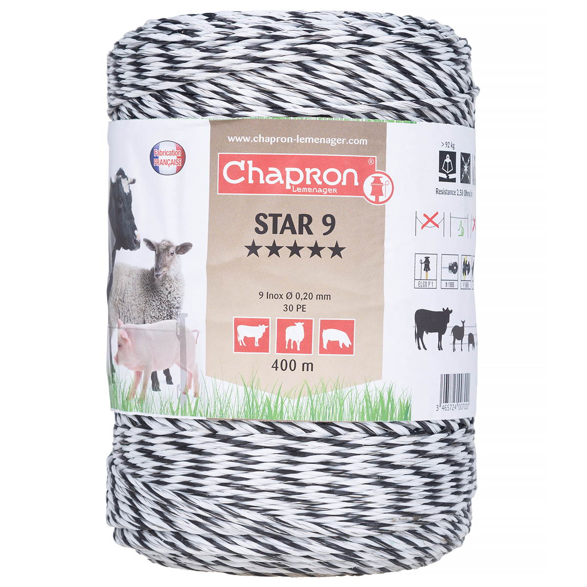 Super przewodząca plecionka do bardzo długich ogrodzeń elektryczny STAR 9 firmy CHAPRON wykonana z materiałów w super jakości. Plecionka ta dedykowana jest do długich i bardzo długich ogrodzeń dla praktycznie każdego typu zwierząt. Podstawową zaletą plecionki STAR 9 wysoka przewodność, duża odporność na działanie czynników atmosferycznych oraz doskonała widoczność, nawet z dużej odległości. Model CORDON TORONNE firmy CHAPRON wykonany jest z materiałów najwyższej jakości. W linkę polietylenową wykonaną z 30 nici odpornych na promieniowanie UV, wpleciono aż 9 drucików ze stali nierdzewnej o grubości 0,2 mm każdy.