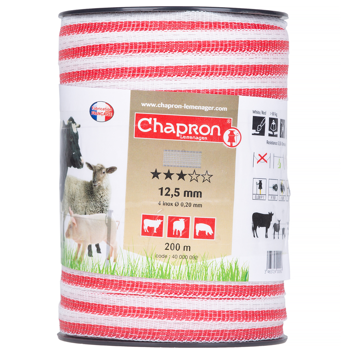 Wytrzymałość taśmy na zrywanie: >80kg. Dwubarwne włókna w kolorze białym i czerwonym sprawiają, iż ogrodzenie jest lepiej widoczne i bardziej respektowane przez zwierzęta.